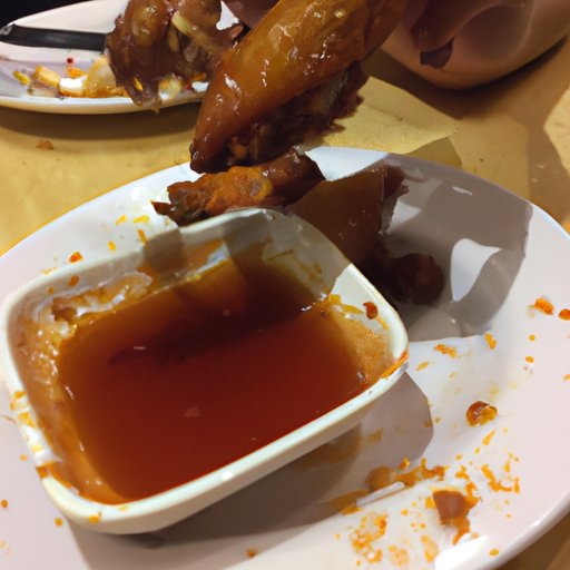 Now it’s time to dip and eat your wings! Start by dipping the wing into the sauce of your choice. Be sure to coat it well and make sure the sauce gets into all the nooks and crannies of the wing. Once the wing is fully coated, take small bites to savor the flavor. This will help you to appreciate the texture and taste of the wings, as well as the flavor of the sauce.